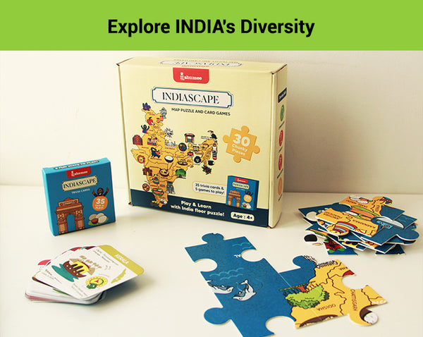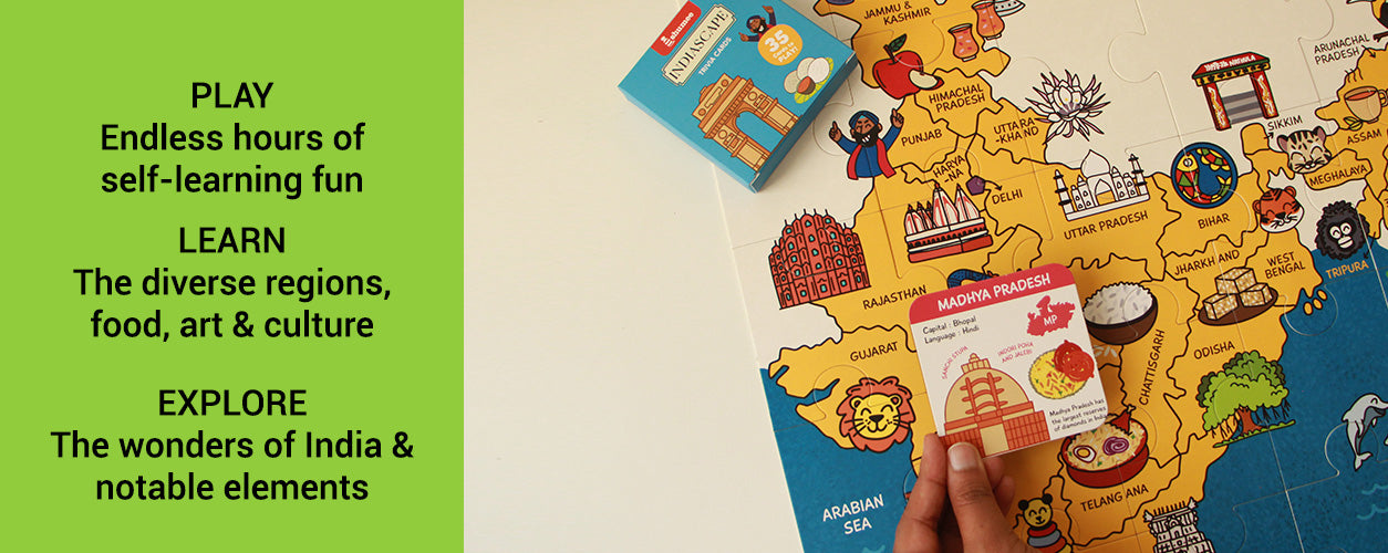 Explore the beauty of India with Indiascapes Learning Set - an educational card game, activity book, and puzzle designed for ages 5 and up. This vibrant learn about India game takes players on a journey across India's diverse landscapes, enhancing their knowledge of geography and culture. Perfect for family fun, this learning card for kids combines learning with engaging play through a beautifully illustrated combo set.