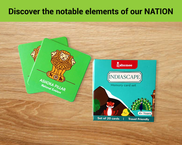 Learn about India and national symbols with our engaging and educational memory card game for kids. Indiascape memory match card game includes 20 thick tile cards (10 pairs), each featuring important Indian national symbols such as the national fruit, animal, bird, monument, and more. This memory flip card game is designed to be fun and informative, helping children learn interesting facts about each symbol while improving their memory skills. The memory card game is a great way for children to learn about India's national symbols interactively and enjoyably, whether at home or on the go.
