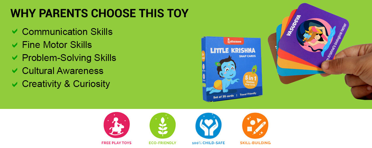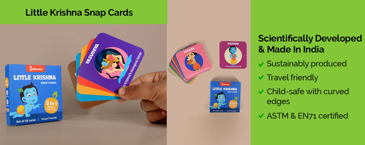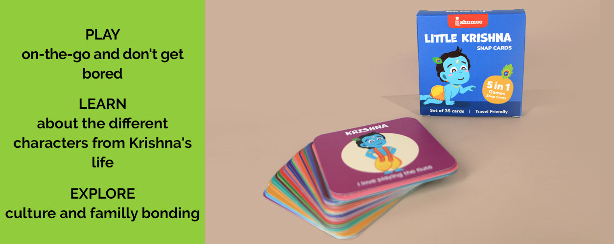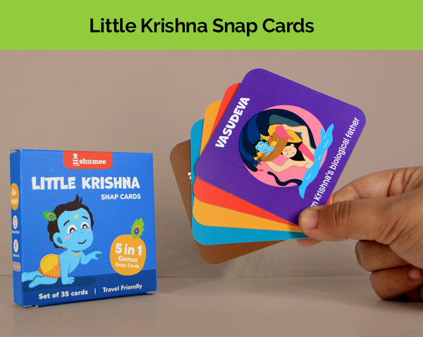 - Let your child experience the enchanting tales of Lord Krishna with this card set! It includes 35 beautifully illustrated cards with 14 Krishna characters and 3 action cards, plus 4 how-to-play cards with 5 fun games and more ideas to create as you go. Compact and travel-friendly, this set blends learning with play, making it a warm and engaging way to explore Krishna’s adventures while fostering cultural awareness and sparking imagination.