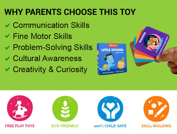 This travel-friendly card set blends learning with play, offering a warm and engaging way to explore Krishna’s adventures. It promotes cultural awareness and sparks imagination while providing numerous developmental benefits.