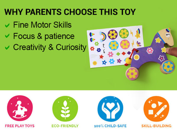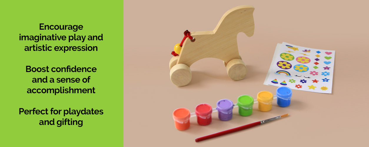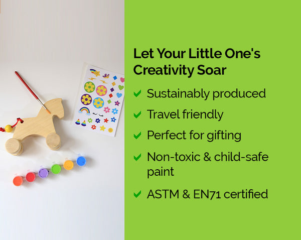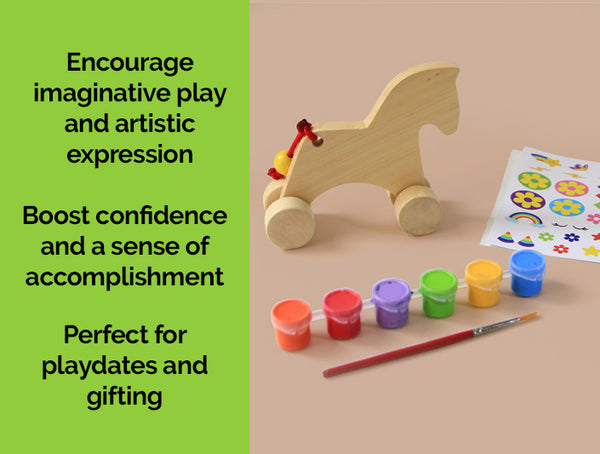 This charming wooden unicorn art kit for kids, part of our Paint Your Own Series, is a blank canvas for your child's imagination. With wheels for easy play and a wagging tail, this unicorn painting kit is ready for your little artist's magical touch! Made with high-quality wood and non-toxic paint, your children will love building their own unicorn toy.