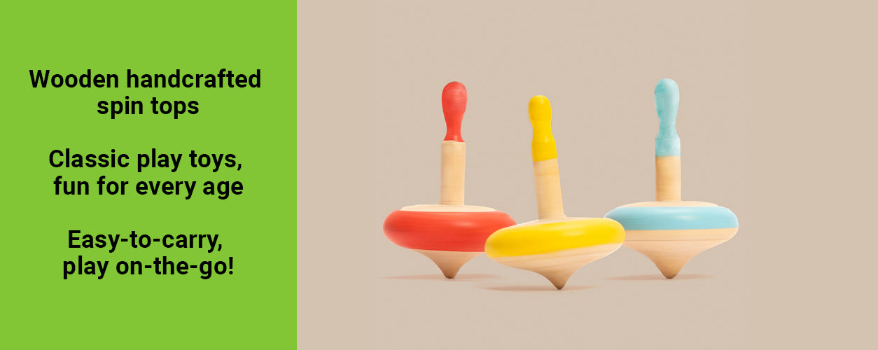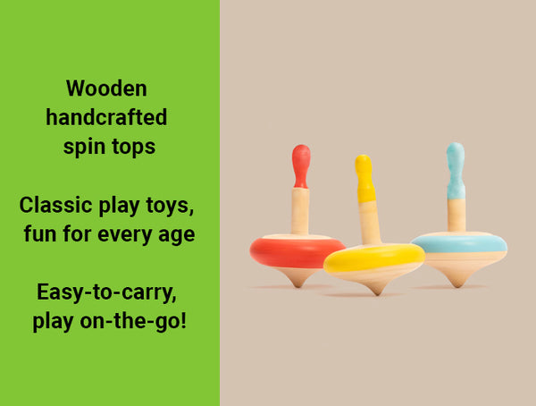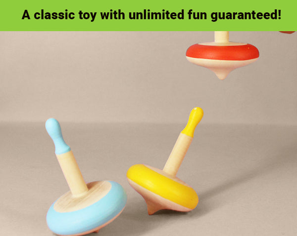 Get spinning with this classic take on wooden spin tops. Put it on the floor and spin away! Easy to carry, great for playdates or to engage child while waiting at restaurants. Bright and colourful, these tops are fun and will get the whole family playing this classic, nostalgic game!