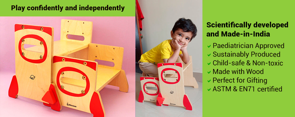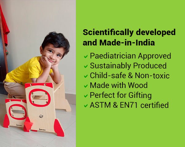 With its sturdy 6 wooden planks, 2 sets of secure lock parts and fun rocket design, your child can carry it anywhere and adjust it to three heights, making this folding wooden step stool perfect for various activities and ages. Scientifically developed and made in India, our folding wooden step stool for toddlers and kids of age 10 is child-safe and non-toxic, making it a perfect gift for kids.