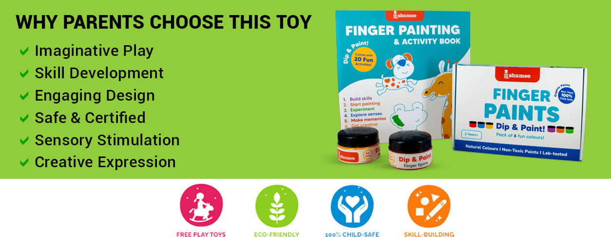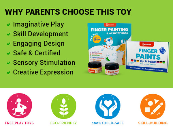 The Finger Paints - Dip and Paint is designed as a fun way for your child to explore their creative side and develop their sensorial skills. Child can dip their fingers into the containers of paint and explore textures and create masterpieces! The activity book encourages children with interesting prompts to explore. Squishy texture of paints on fingers encourages child to explore creatively and finger painting as an activity helps hone fine motor skills.