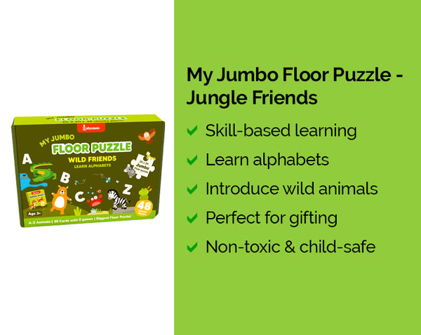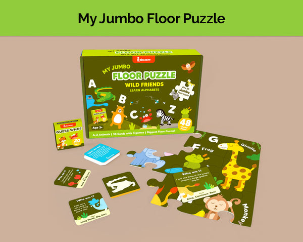 Dive into a world of wonder with our 48-piece Jumbo Floor Puzzle that stretches 2ft by 3 ft! With vibrant animals, birds, and marine life, this wildlife jigsaw puzzle transforms playtime into an exciting educational journey. The large, colourful pieces depict a delightful range of 26 illustrated animals each corresponding to a letter from A to Z, from jungle giants to ocean marvels, all while introducing children to the alphabet fun and engagingly.