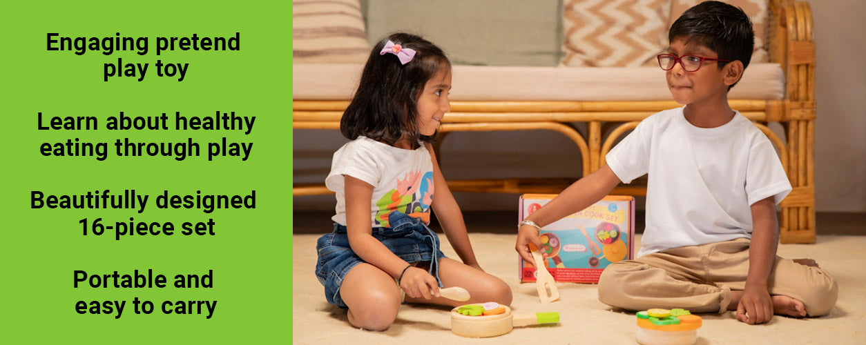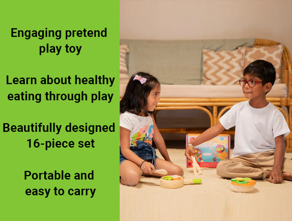 The brightly coloured fruits and vegetables in our wooden cooking set toy will make kids curious about different kinds of food.