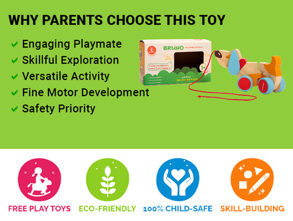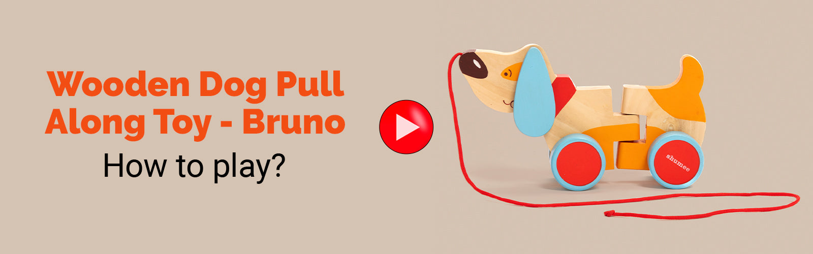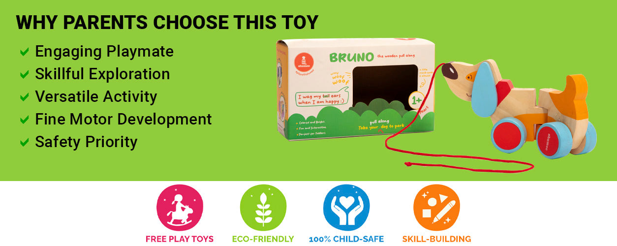Introducing Bruno, the adorable wooden pull-along toy! With wiggling ears and a wagging tail, Bruno offers fun learning experiences for your child, promoting multi-skill development along the way.