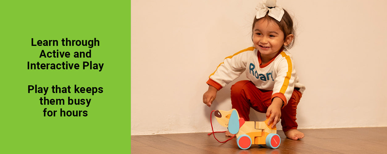- Fine Motor Skills: Exploring the moving parts and large wheels of the dog toy helps improve the fine motor skills of the child. After the age of 12 months, kids start grabbing, picking and holding things. Playing with this toy can help in developing these fine motor skills as children turn the wheels and interact with the toy.