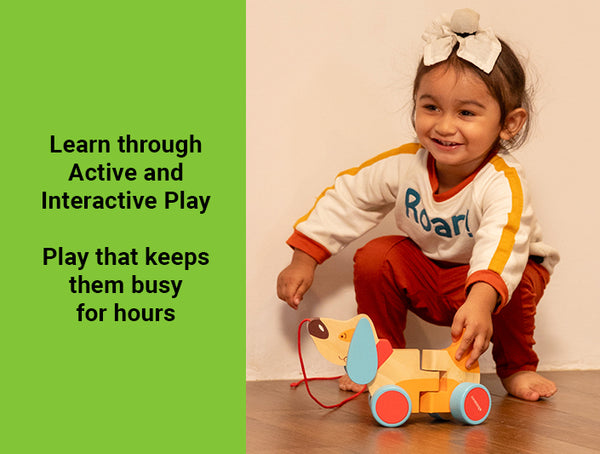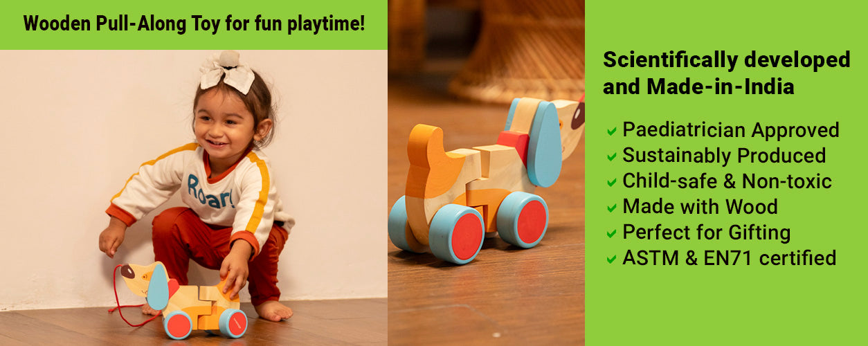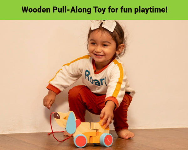 - Gross Motor Skills: Pulling the toy dog helps your child achieve balance and coordination while walking. It makes walking a fun game instead of a boring activity for them, which makes them want to walk more! Kids also sit on their knees to play with the dog, which strengthens their muscles.