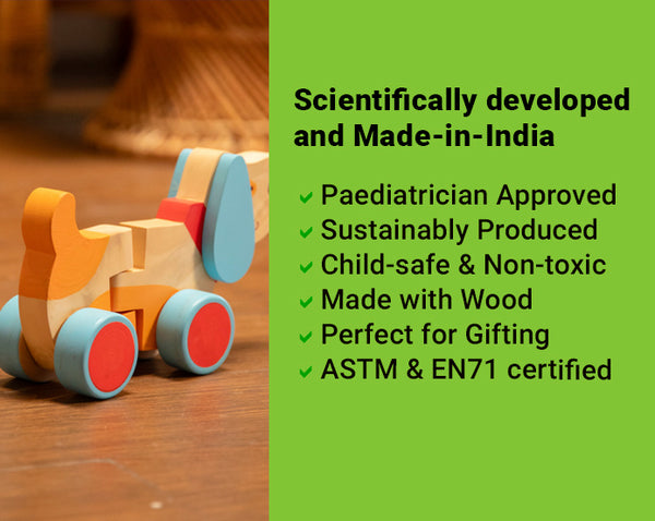 Imagine your little one taking their pet dog for a walk! With this wooden dog pull-string toy, your child can pretend to have a pet dog. Made from high-quality ivory wood, this wooden pull toy is safe for your child as it does not contain plastic. Not just this, the colours are non-toxic, so you don't have to worry about your child putting the pull toy in their mouth. Do you know what is the best part of this toy? The ears and tail wiggle to give it a lively feel. Your baby can have a happy dog while they learn to walk properly.