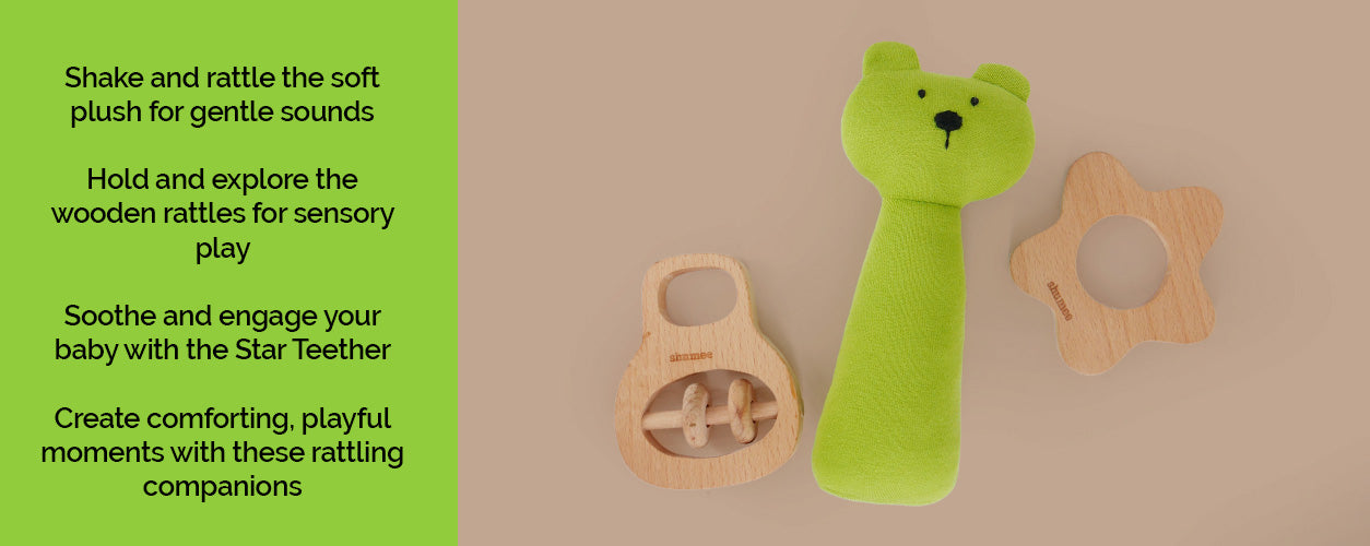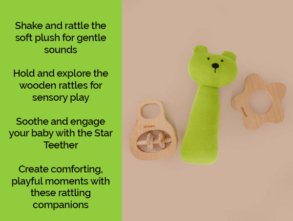 - Gentle Sensory Play: The plush toy and wooden rattle provide perfect sensory stimulation through different textures, sounds, and shapes.