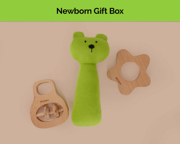 Introducing our thoughtfully curated baby gift kit that includes a soft organic plush toy with a rattle inside, along with a wooden rattle and teether. Embrace cuddles and comfort with our adorable plush friends for babies. Buy gift sets for newborn and newborn hampers at Shumee today!
